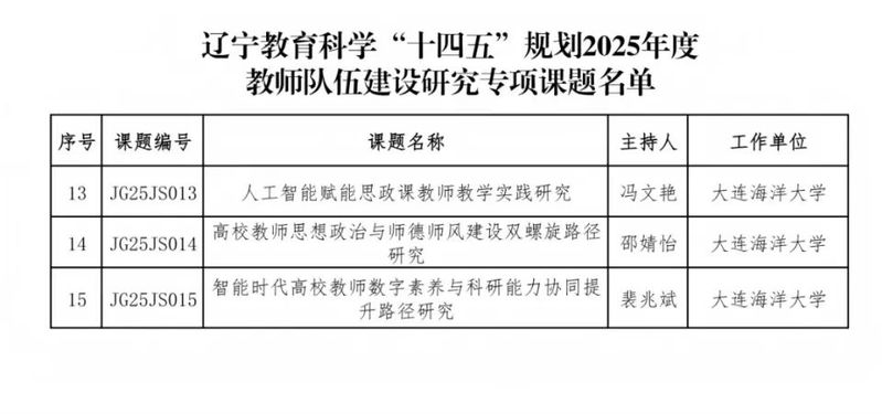近日,辽宁省教育科学规划领导小组办公室发布了《关于批准辽宁省教育科学“十四五”规划2025年度立项课题的通知》及《关于批准辽宁省教育科学“十四五”规划2025年度教师队伍建设研究专项课题的通知》,东北亚研究中心2项课题喜获批准立项。其中,东北亚研究中心研究员、法律事务部办公室主任、海洋法律与人文学院教师翟姝影博士申报的《产教融合视域下辽宁涉海高校服务区域海洋经济的路径研究》获批辽宁省教育科学“十四五”规划2025年度课题立项;东北亚研究中心主任、法律事务部主任、总法律顾问、法学学科带头人裴兆斌教授申报的《智能时代高校教师数字素养与科研能力协同提升路径研究》获批教师队伍建设研究专项课题立项。